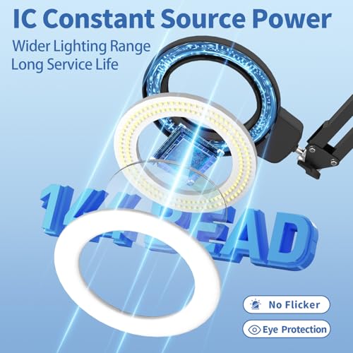 - ¡¼2-in-1 Design & Powerful Swing Arm¡½This magnifier with light serves as both a desk and clip lamp. Large 9.06-inch base prevents tipping, addressing issues with smaller bases. The sturdy metal clip is suitable for workbenches/desk/tables, and the 4 springs and 3 knobs ensure stability and flexibility.