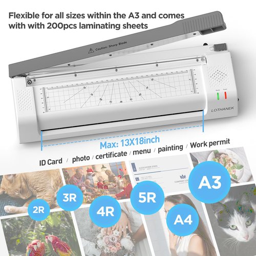 - 【A3 Laminating Machine with 100 PCS Laminating Sheets】:It is flexible for all sizes within the A3 and comes with 200pcs laminating sheets including 100 Pcs for A4, 50 Pcs for 4R,50 Pcs for 3R and 50 Pcs for 2R, which is perfect for home use, school, and office lamination needs.