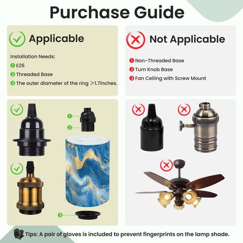 - [Easy to Install] Our cylindrical lampshade is easy to use and remove, which takes only a few minutes and no additional tools are required. All you need to do is use the E26 socket ring (not included) to secure the lampshade to the lamp. To prevent fingerprints from getting on the lampshade, we also include a pair of gloves in the package.