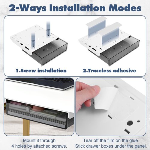- Easy to Install: There are 2 installation methods, screw installation or double sided adhesive installation. With four strong-power self-adhesive tapes, the small under desk drawer attaches to the clean surface tightly and will not drop-off. The screws are alternative if you do not want to use the tapes. Maximum load capacity is 10kg.