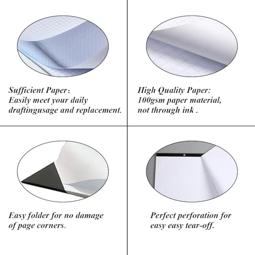 - HIGH QUALITY - Grid paper pad is used to high quality 100gsm pure white premium acid-free paper, so you can confidently use most pens, pencils, and markers without ghosting and bleed-through. sheets are perforated for easy and neat sheet removal, And sturdy strong 1200 GSM backer to protect desktops.Triangle bound corners protect graph paper.