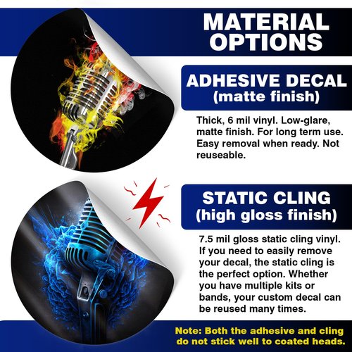 - ADHESIVE DECAL & STATIC CLING - Choose between our water proof stickers, a single-use with durable 6mil matte vinyl, and our reusable Static Cling in 7.5mil gloss vinyl. Designed for smooth plastic bass drum heads. The actual size of the decal is 1/2" smaller than the size ordered. Example, a 22 inch decal is 21.5 inches since that is the flattest part of the drum head. This helps the decal from curling on the edges.