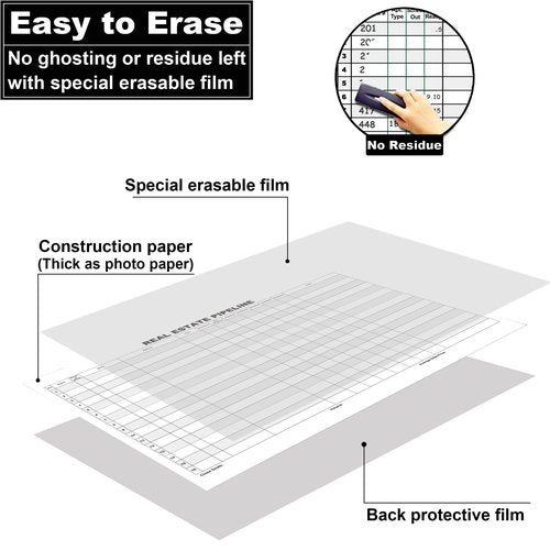 - ERASABLE & REUSABLE REAL ESTATE TRACKER BOARD:Our real estate pipeline is made of 250 gram per square meter construction paper,same thicker as photo paper.The surface is laminated by special dry erase film,we can erase easily even months later,no ghosting or staining