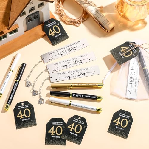 - 40Th Birthday Favors Set: this incredible 40th anniversary party favors package provides guests with an all inclusive set that includes 25 pieces 40th birthday pens, 25 pieces birthday metal bookmark, 25 pieces thank you tags, and 25 pieces organza bags; Additionally, a bundle of rope is provided for convenience, enough and eye catching, a nice combination to meet your decorative needs at your party