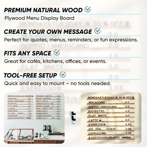 Each letter measures approximately 4 cm (1.57 inches) in height and is laser-cut from premium custom wooden signs, offering a modern and minimalist look. The letterboard letters are compatible with optional custom wooden signs (sold separately), allowing you to build a message board letters that fits your space — from compact displays to large menu board for restaurant.