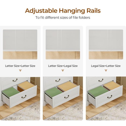 - Multifunctional File: Designed to hold files of all sizes, including Legal, Letter, this file cabinet offers the flexibility to store and manage a variety of file formats. The hanging rods can be easily removed to transform the drawers into multi-functional storage space for clothing, accessories or seasonal items