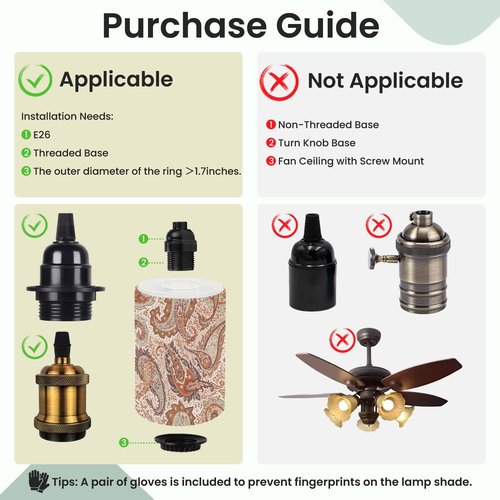 - [Easy to Install] Our cylindrical lampshade is easy to use and remove, which takes only a few minutes and no additional tools are required. All you need to do is use the E26 socket ring (not included) to secure the lampshade to the lamp. To prevent fingerprints from getting on the lampshade, we also include a pair of gloves in the package.
