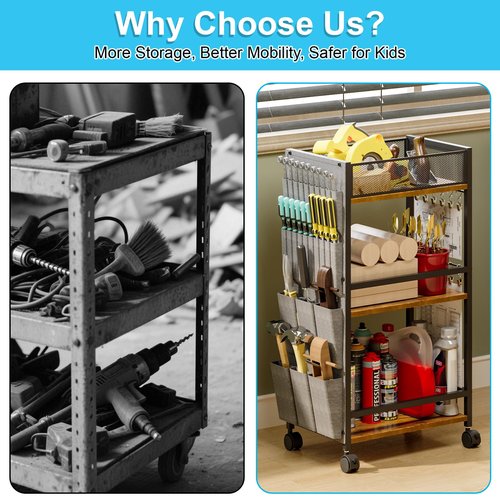 - ✔ 【Metal + Rustic Wood Design – Durable & Stylish】 Our rolling cart organizer features black metal paired with vintage-style wood for a warm, rustic touch. More than a storage solution—it’s a decor piece for studios, living spaces, and beyond.