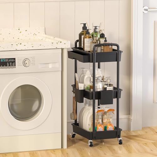 - ¡¼Extra Storage Space¡½Our 3-tier storage rolling cart is equipped with drawer and comes with 2 hanging cups and 4 hooks, maximizing space effortlessly in kitchens, living room, bathrooms, office, or art craft rooms.