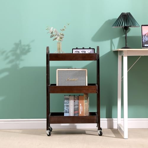 3-Tier Wooden Rolling Cart- Wooden Utility Cart wit Wheels- Utility Rolling Cart-Storage Trolley Organizer- Rolling Kitchen Cart Serving Cart for Office,Kitchen, Kids' Room (Walnut Color)