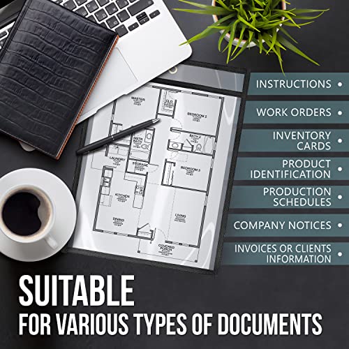 - ?? CONVENIENT JOB TICKET HOLDER - The inside size of clear pocket sleeves is 9x12 inch and the outside is 10x14 inch. Simply insert & remove up to 20 sheets. Plastic document holder opens on short side, has a convenient eyelet at the top for handing.