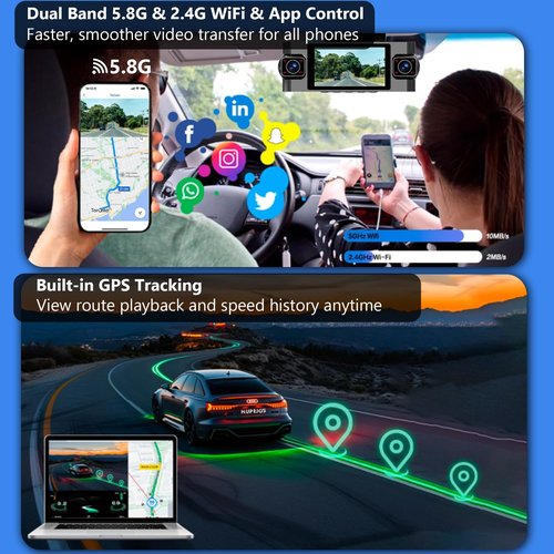 - 【5.8GHz &2.4G WiFi &GPS&Wireless App Control 】its built-in dual-band 5GHz and 2.4GHz WiFi, you can use the dash cam app to view and manage dash cam recordings instantly on your iPhone and Android smartphone. Built-in GPS saves route, speed, and location data in each video—easily review or play back via REDTIGER Player with synchronized front, rear, and cabin views. Perfect for road trips, daily driving, or evidence collection.