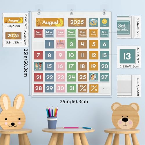 - Large Size with Space Saving Design: Measuring 25" x 25", this calendar pocket chart maximizes wall space like classroom, daycare centers, homeschool rooms, or bedroom walls. Large pockets accommodate standard cards plus student artwork, dry-erase notes or stickers