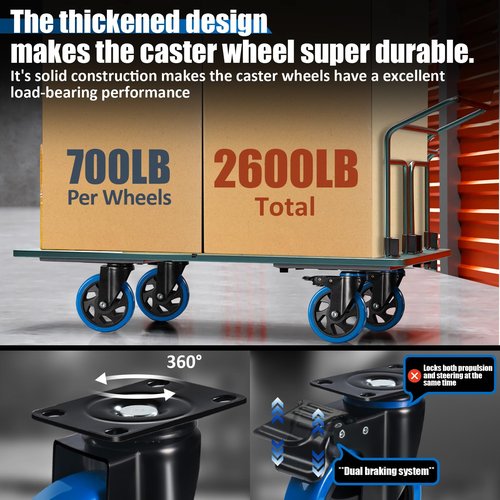 - 【Casters set of 4 heavy duty: Floor-Friendly Power Movers】From garage workbenches to commercial kitchen carts, the industrial casters wheel deliver smooth 360° rotation with dual-brake locks for precise braking. The non-marking polyurethane can protect floors, while sealed bearings resist dust and humidity. Upgrade any mobile system with confidence!