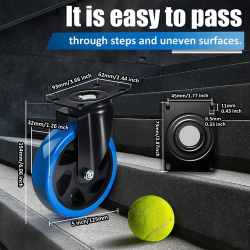 - 【Why 5 inch caster wheels Matters? Bigger Wheels, Fewer Struggles】5 inch casters beat small wheels with 3x higher obstacle clearance(rolls over cracks/gravel effortlessly), 20% wider load distribution(prevents floor damage),and 50% longer bearing lifespan.The thick treads absorb shocks --perfect for workshops and heavy furniture.
