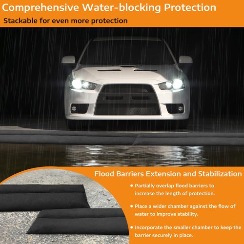- Package Content: The package includes 5 pieces of flood barriers for home use, each approximately 5 ft x 7.8 inches before absorbing. Overlap flood barriers for extended protection. Position the wider chamber against the water flow, using the smaller chamber for stabilization