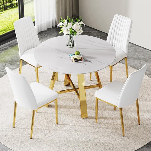- 【Elegant Round Dining Table Set for 4】This 42-inch round dining table set for 4 features a smooth faux marble tabletop and a sturdy gold metal base, combining minimalism with high-end design. The included upholstered chairs provide excellent comfort, completing a 5 piece dining table set perfect for couples or small families. It’s a great fit for apartments or urban homes, and ideal for a dining room table set for 4 round layout.