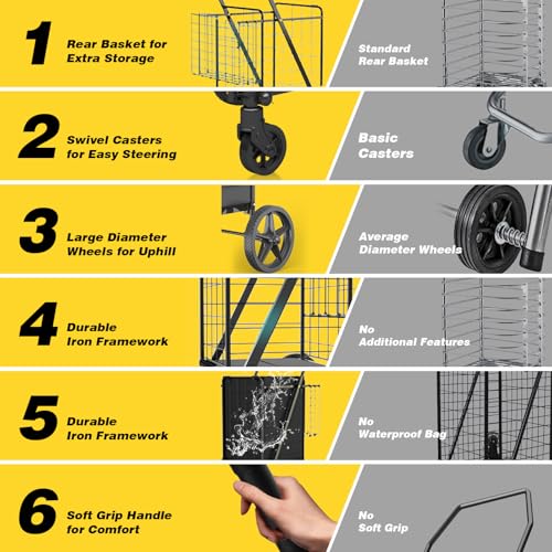 - ¡¼Swivel Front Rolling Wheels¡½: The 360-degree swivel front wheels make maneuvering the shopping cart incredibly easy. The oversized rear wheels are durable and made of rubber, resisting wear and reducing noise. The cart moves, glides, and rotates effortlessly on sidewalks or uneven surfaces, allowing you to transport items to your apartment, laundromat, or post office with ease.