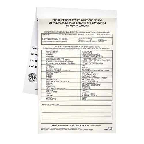 Forklift Operator Daily Checklist 25-pk. - Bilingual, Book Format with 31 Sets, 2-Ply, Carbonless, 5.5" x 8.5", Safety & Maintenance Forklift Checklist Inspection Book, J. J. Keller & Associates, Inc.