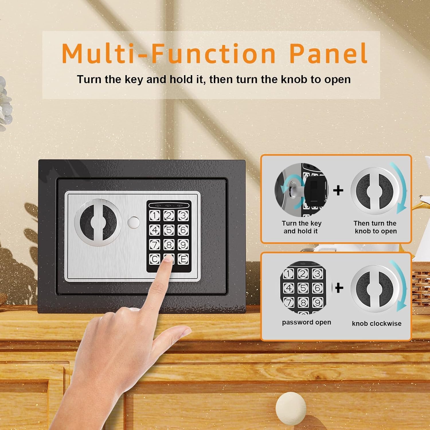 - ✅【User-Friendly Operation】Our safe offers 2 versatile unlocking methods for added convenience and security. You can use the key and knob for straightforward access or set 2 distinct and independent passwords via the digital password entry knob. This unique feature provides flexibility and ensures a secure, user-friendly experience.