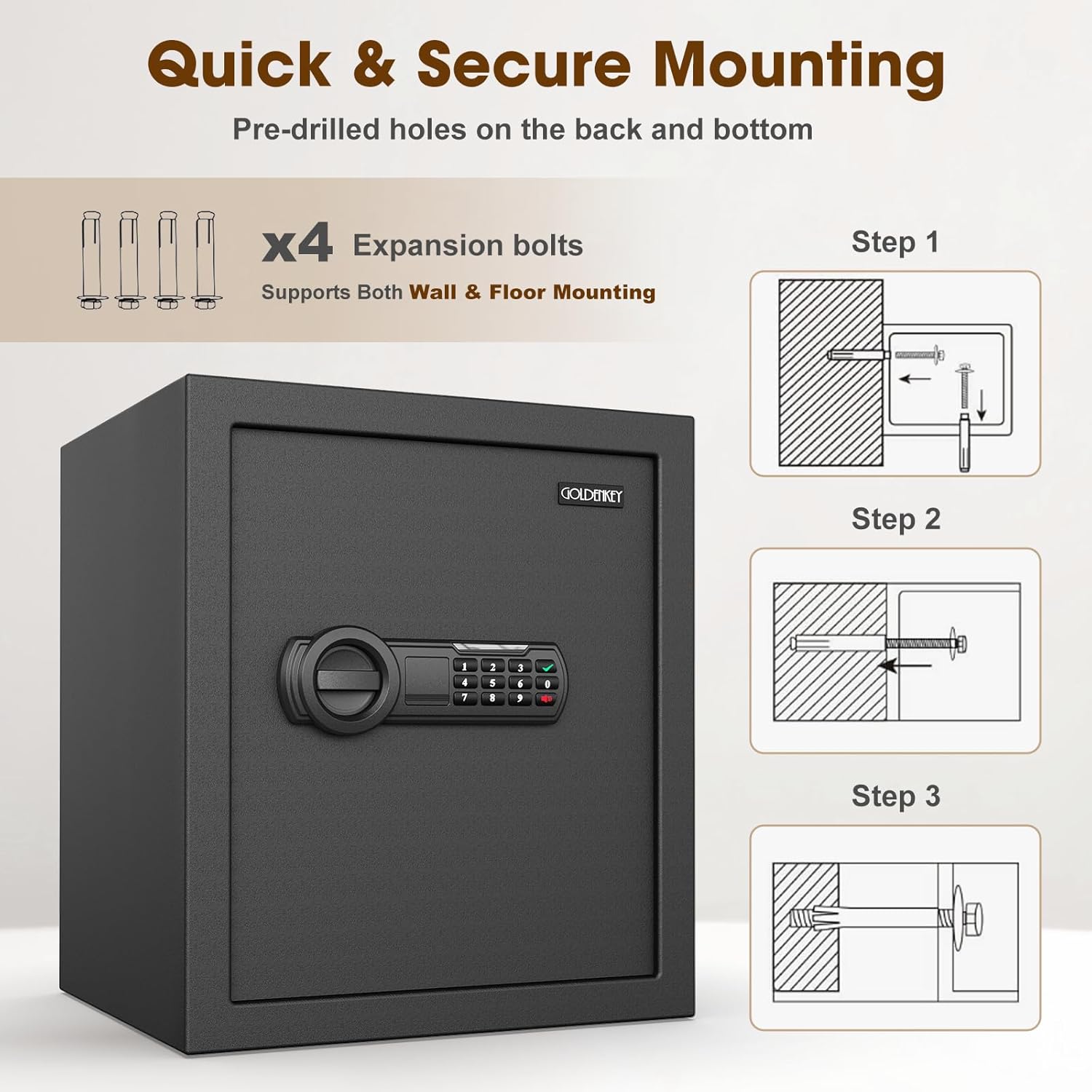 GOLDENKEY's safes are pre drilled with installation holes and equipped with necessary mounting screws, allowing you to install them on walls/floors